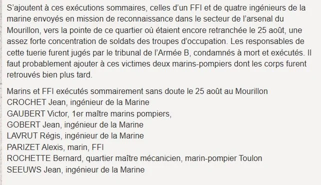 Lire ci-dessous les circonstance tragiques de la mort d’Alexis Pariset et autres ingénieurs et marins pompiers fusillés par les allemands pendant la libération de Toulon