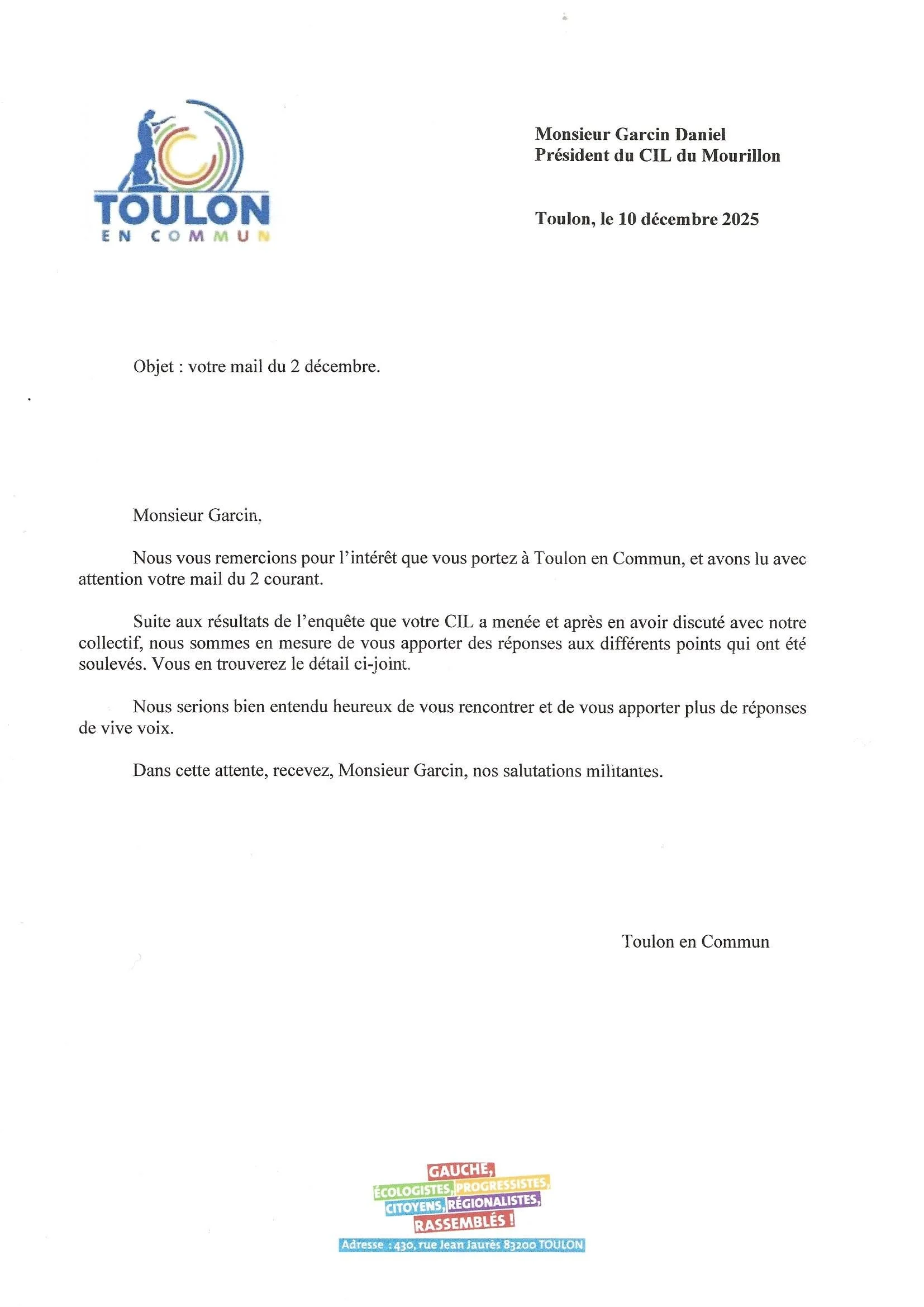 Nous vous rappelons que les résultats de l’enquête du CIL du Mourillon et les questions qui ont été envoyées aux candidats aux élections municipales de 2026 sont disponibles sur ce même site à la page ‘ ACTUALITE’