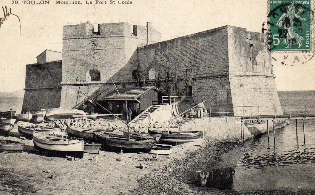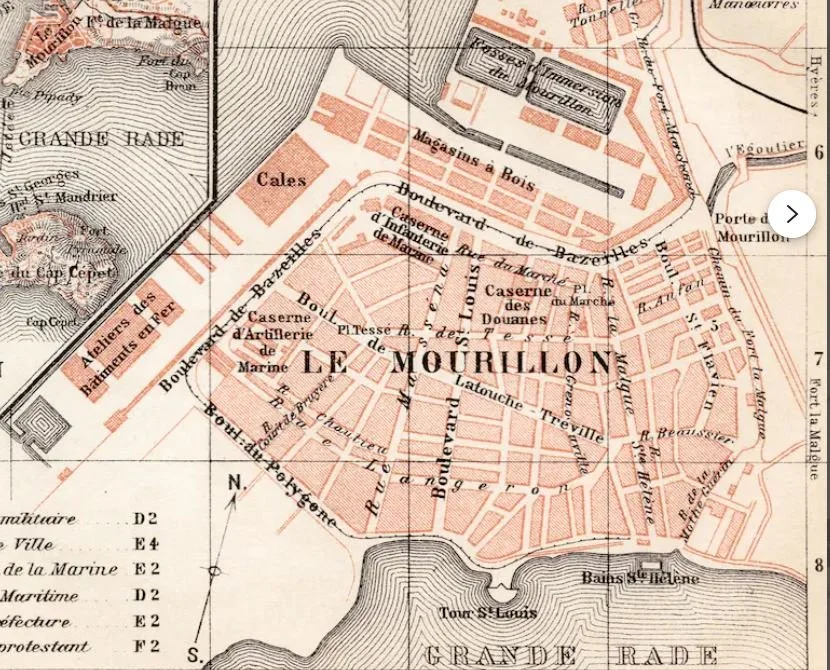 Extrait d’une carte du quartier du Mourillon vers 1907 où l’on peut voir dans la Grande Rade la position de la ‘tour ou fort’ St Louis près des Bains de mer Ste Hélène